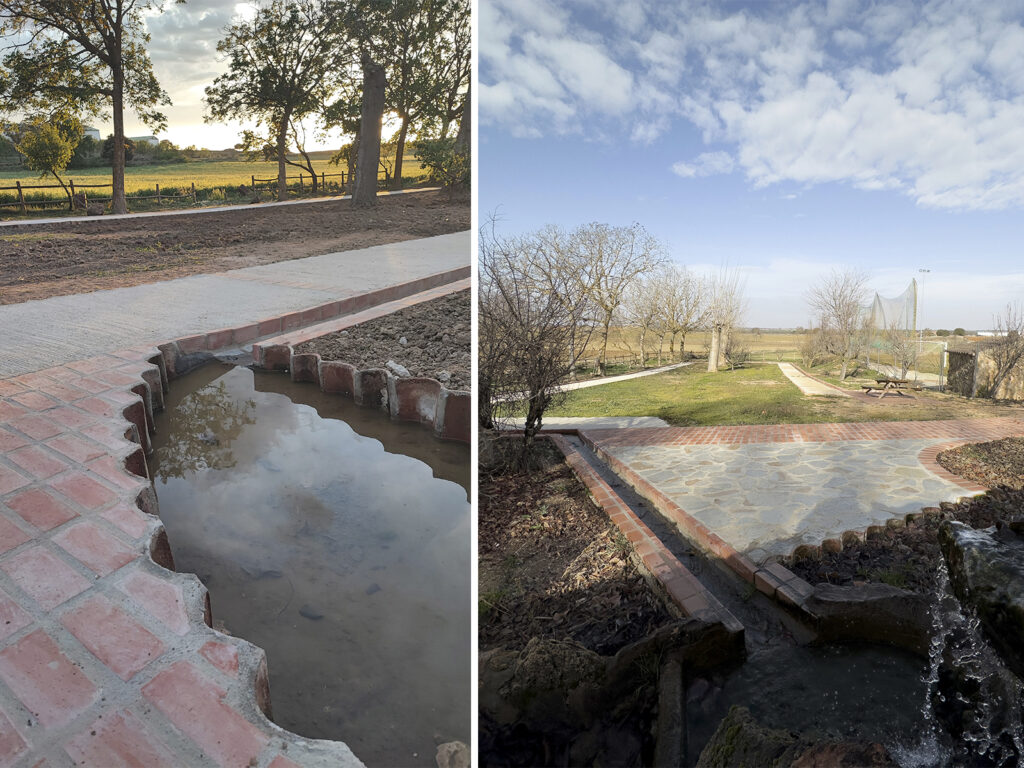 Reorganización de aguas en superficie mediante un recorrido transitable que mejora accesibilidad y ordena la vegetación, creando espacios de reunión conectados con el entorno. Se reutilizan tejas de derribo en los remates, aportando sostenibilidad y memoria material. Una acequia canaliza el agua y acompaña el paseo, uniendo infraestructura y paisaje. La propuesta favorece la gestión hídrica y enriquece la experiencia en un espacio público accesible, donde agua y vegetación son protagonistas.